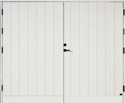 Vackra garageportar i trä och stål. Två dörrar som är hängda på gångjärn och öppnar utåt.